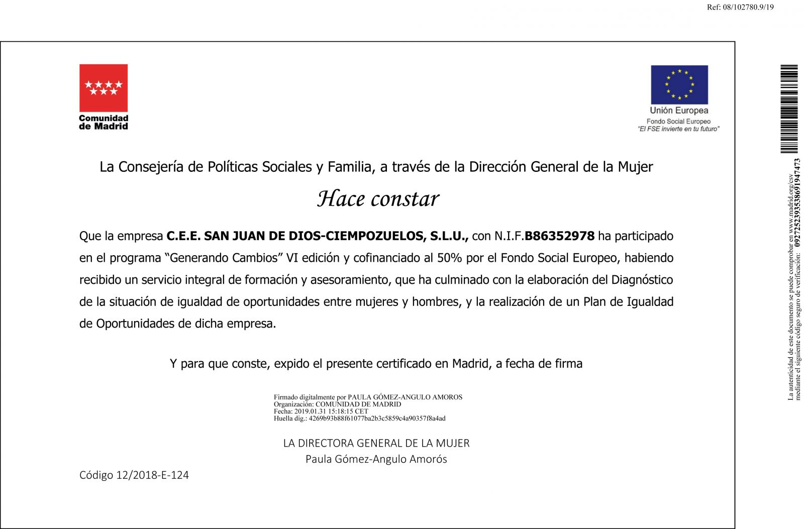 Con fecha del 31 de enero de 2019, el Centro Especial de Empleo San Juan de Dios-Ciempozuelos obiene por parte de la Consejería de Políticas Sociales y Familia, a través de la Dirección General de la Mujer el reconocimiento de la realización del Plan de Igualdad de Oportunidades por parte del CEE tras su participación en el programa “Generando Cambios” VI edición.